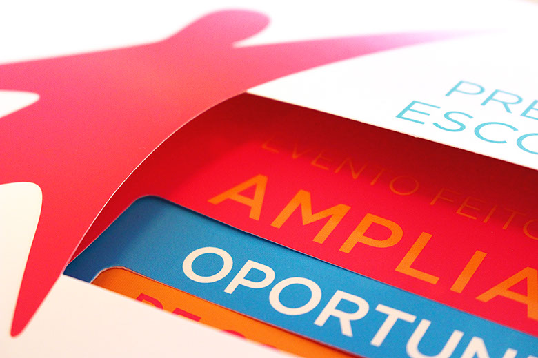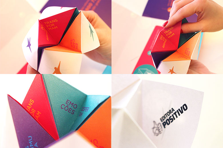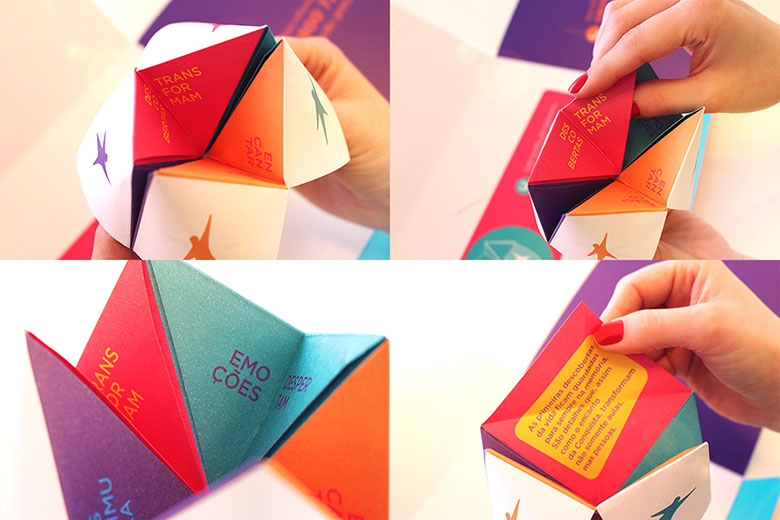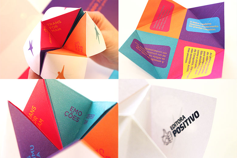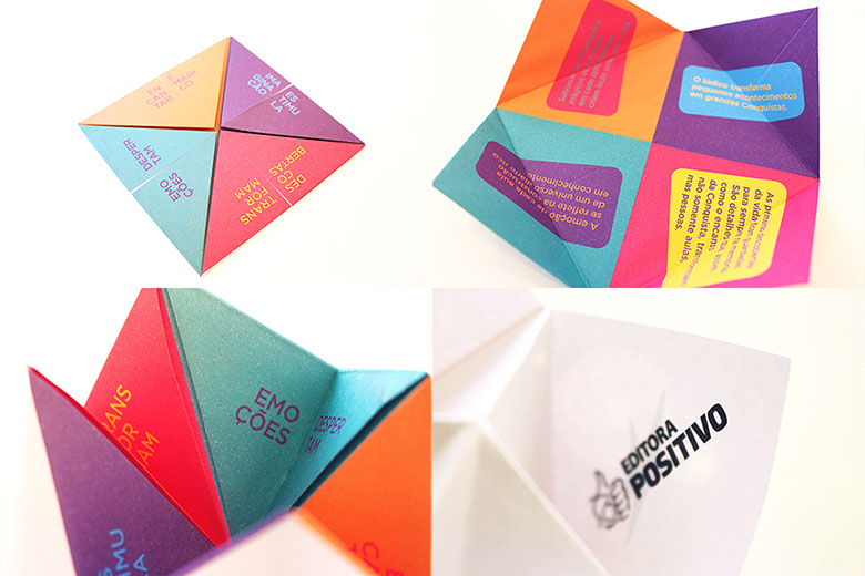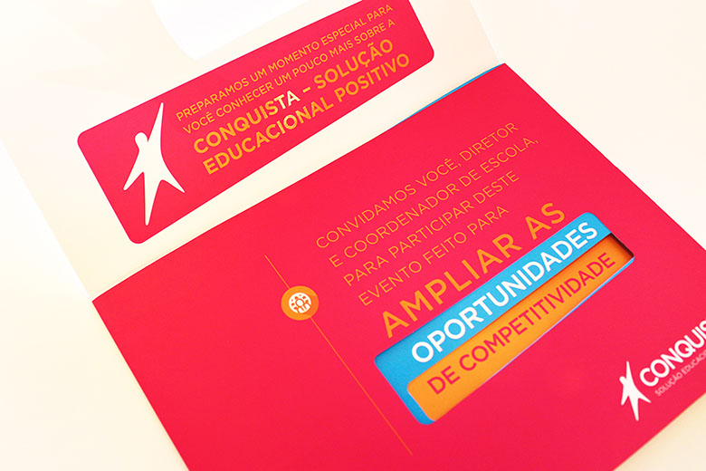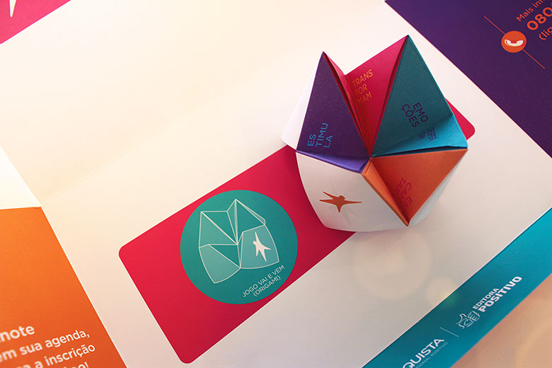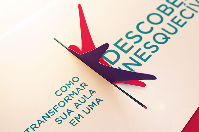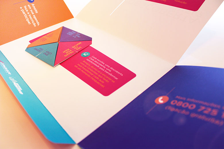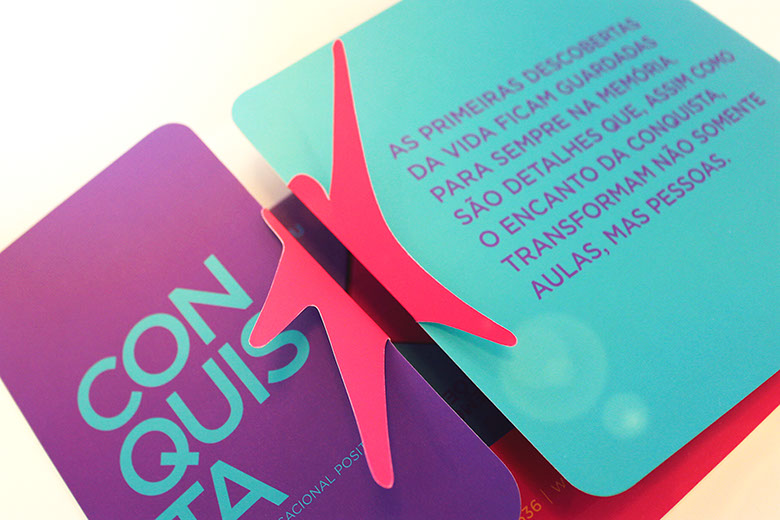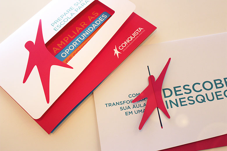 O uso de elementos interativos ampliou a sinergia da comunicação, criando uma relação de empatia logo no primeiro contato. Para reforçar a essência da Solução Educacional Conquista, foi proposto um jogo inspirado no origami vai e vem, uma solução lúdica que remete à infância dos educadores.